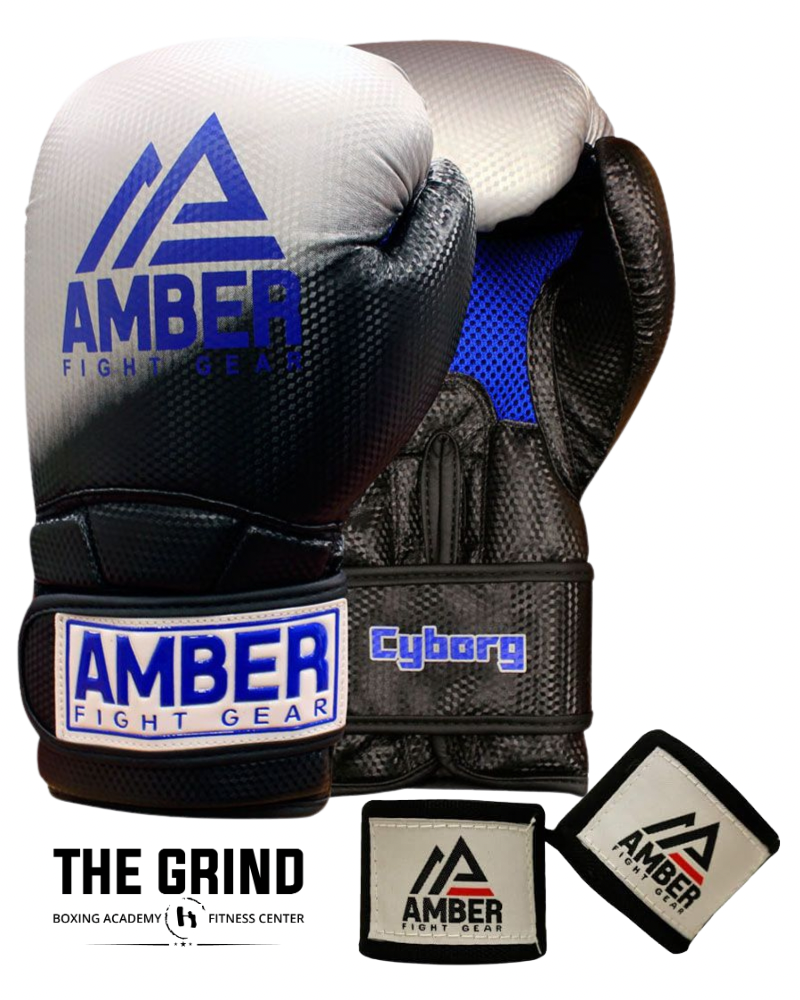 Introducing the Grind Boxing Academy Starter Kit, featuring premium AMBER Fight Gear Cyborg Boxing Gloves and matching hand wraps. These gloves are designed for both comfort and durability, providing superior hand protection with a sleek carbon fiber texture and secure Velcro closure. The striking blue and black design symbolizes power and precision, perfect for beginners and experienced fighters alike. Paired with high-quality hand wraps, this kit ensures your hands and wrists are supported, allowing you to train harder and longer. Step into the ring with confidence—equip yourself with the best.